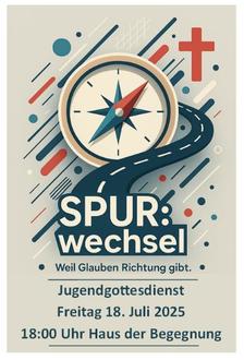 Du suchst Orientierung? Hast das Gefühl, manchmal auf der falschen Spur unterwegs zu sein oder willst einfach mal den Kurs wechseln? Dann bist du genau richtig beim Jugendgottesdienst am Freitag, den 18. Juli 2025 um 18:00 Uhr im Haus der Begegnung. Unter dem Motto „SPUR:wechsel - Weil Glaube Richtung gibt“ nehmen wir dich mit auf eine kleine Reise mit cooler Musik, Anstößen zum Nachdenken und der Einladung, über Gott und deinen Weg nachzusinnen. Denn manchmal braucht es einen Spurwechsel, um wieder klarer zu sehen, wo es langgeht im Leben.