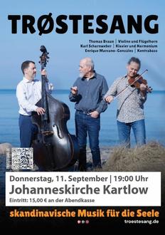 Herzlich laden wir am Donnerstag, dem 11. September um 19 Uhr zu einem besonderen Konzert mit dem Ensemble „TrØstesang“ aus Rostock in die Kartlower Johanniskirche ein. Lasst euch von den wunderschönen skandinavischen Klängen verzaubern. Mit Violine & Flügelhorn (Thomas Braun), Klavier & Harmonium (Karl Scharnweber) sowie Kontrabass (Enrique Gonzales) schaffen sie bewegende Klanglandschaften zwischen nordischer Volksmusik, Jazz und meditativer Stille. Musik zum Innehalten, Lauschen und Träumen - eine warme Umarmung für die Seele.