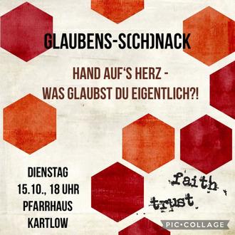 Bei unseren letzten Treffen hatten wir einen ziemlich netten Schnack über Gott und die Welt und unsere Erfahrungen mit dem Glauben bei leckeren Snacks in unserem Pfarrhaus. Darum laden wir gern wieder zu einer weiteren Runde ins Pfarrhaus Kartlow ein, am Dienstag, den 15. Oktober um 18:00 Uhr.