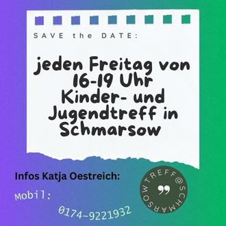 Weiter laden wir euch herzlich jeden Freitag von 16 - 19 Uhr ins Gemeindehaus Schmarsow zum Kinder- und Jugendtreff. Am 27.9. wollen wir zusammen Waffeln backen und im Oktober wollen wir zusammen Naturmaterialien sammeln und damit basteln, Schnitzen und einfach wieder eine schöne Zeit zusammen haben. An den Ferien- und Brückentagen ist aber zu. Wir freuen uns auf euch!!!
