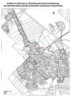 Zur Erhaltung der Zusammensetzung der Wohnbevölkerung und zu ihrem Schutz vor der Verdrängung durch touristisch genutzte Übernachtungs-möglichkeiten wird auf Grundlage des § 172 Abs. 1 Satz 1 Nr. 2 BauGB in der Fassung der Bekanntmachung vom 03.11.2017 (BGBl. I S. 3634), zuletzt geändert durch Artikel 2 des Gesetzes vom 26.04.2022 (BGBl. I S. 674), in Verbindung mit § 5 Abs. 1 und § 22 Abs. 3 Satz 6 der Kommunalverfassung des Landes Mecklenburg-Vorpommern (Kommunalverfassung - KV M-V) vom 13.07.2011 (GVOBl. MV, S. 777), geändert durch Artikel 1 des Gesetzes vom 23. 07.2019 (GVOBl. M-V, S. 467), GS Meckl.-Vorp. Gl. Nr. 2020 - 9, mit Beschlussfassung durch die Gemeindevertretung des Ostseebades Trassenheide vom 07.12.2022 folgende Erhaltungssatzung erlassen.