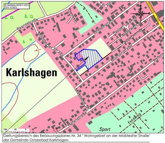 Für das in beigefügtem Übersichtsplan gekennzeichnete Gebiet beschließt die Gemeindevertretung Karlshagen die Aufstellung des Bebauungsplanes Nr. 34 für das „Wohngebiet an der Mildstedter Straße“: