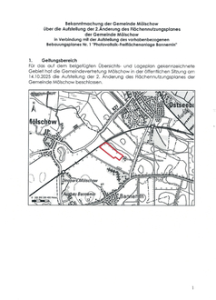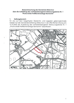 Für das auf dem beigefügten Übersichts- und Lageplan gekennzeichnete Gebiet hat die Gemeindevertretung Mölschow in der öffentlichen Sitzung am 14.10.2025 die Aufstellung des vorhabenbezogenen Bebauungsplanes Nr. 1 „Photovoltaik-Freiflächenanlage Bannemin“ beschlossen.