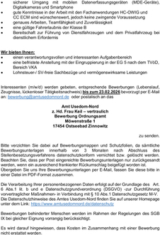 Interessenten (m/w/d) werden gebeten, entsprechende Bewerbungen (Lebenslauf, Zeugnisse, lückenloser Tätigkeitsnachweis) bis zum 23.02.2026 bevorzugt per E-Mail an: bewerbung@amtusedomnord.de oder postalisch an das