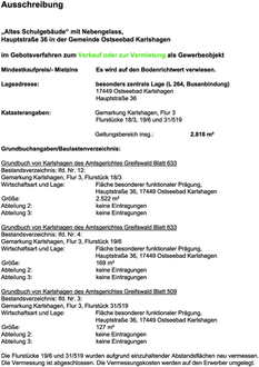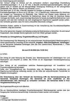 Die Entscheidung über den Verkauf/ die Vermietung trifft die Gemeindevertretung der Gemeinde Ostseebad Karlshagen. Die Gemeinde ist nicht verpflichtet an den Höchstbietenden oder überhaupt zu verkaufen/ vermieten. Die Gemeinde bleibt in ihrer Vergabeentscheidung frei.