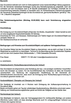 Der Erwerber/Mieter hat das Grundstück/ Objekt zu übernehmen, wie es steht und liegt. Er hat die Möglichkeit es ausführlich zu besichtigen. Termine für die Besichtigung des Grundstückes/ Objektes sind mit dem Amt Usedom-Nord, Möwenstraße 1, 17454 Ostseebad Zinnowitz