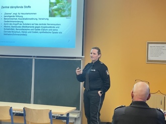 Die Präventionsberater*in der Polizei, Frau Utke und Herr Gückstock, hielten einen spannenden Vortrag und untermauerten diesen mit einem mitgebrachten „Drogenkoffer“. Dieser enthielt neben verschiedenen Substanzen auch Materialien rund um den Konsum von Drogen.