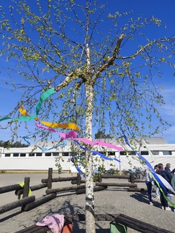So schmückten die Schülerinnen und Schüler die Birken mit Maibändchen, tanzten im Kreis um den Baum und sangen dazu Mailieder. Und das alles bei herrlichem Sonnenschein!