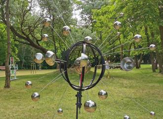 Die Exponate des Künstlers Peter Löffler aus Velten zeigen 5 Skulpturen aus Holz und Metall im Kurparkbereich zwischen Naturschutzzentrum und Konzertmuschel. Löffler liebt die technischen Herausforderungen seiner Kunstwerke, die Endmontage der stets dreidimensionalen Objekte, die deshalb auch keine simplen Skulpturen, sondern Installationen sind. „Mich reizen spannende Dinge, das Probieren und Jonglieren mit Dimensionen und Formen.“ Seinen Schaffensprozess vergleicht er mit einem Kreuzworträtsel. Die Installationen sind bis Oktober im Kurpark zu sehen.
