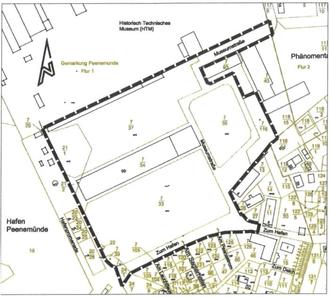 Das Plangebiet liegt zwischen der Hafenpromenade, dem HTM, der Museumsstraße und der Straße „Zum Hafen“. Es beinhaltet die Flurstücke 7/33, 7/34, 7/36, 7/37, 7/39, 7/116, 21/1, 21/2, 22 und 24/1 von Flur 1, Gemarkung Peenemünde. Die Gesamtfläche umfasst rd. 6 ha.