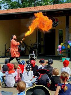 Die Einrichtung hat es sich zur Tradition gemacht, ihre Kinder vor den Sommerferien mit einem großen Fest in die Urlaubszeit zu verabschieden. Unter dem Motto "Anker hoch und Segel setzen!" war es am 14.06. endlich wieder soweit: Groß und Klein waren zum Piratenabenteuer geladen und erlebten in bunten Piratenkostümen einen aufregenden Nachmittag. Zum Auftakt sangen alle kleinen Seeräuber gemeinsam ein extra einstudiertes Lied und eröffneten damit das Fest. Als Spezialgast sorgte der Piratenkäpt`n Chris de Flambö mit seiner sagenumwobenen Piratenshow für jede Menge Spaß und überraschte die Kinder und Eltern mit Seemannsliedern, nervenkitzelnder Feuerakrobatik und Spezialeffekten aus der Kanone. Bei Kuchen, Bratwurst und Getränken tanzten die Kinder bis in den frühen Abend, während sich Eltern und Erzieher ausgelassen austauschen konnten. "Wir alle haben uns sehr auf das Fest gefreut, dass nun endlich wieder stattfinden konnte. Dank des Teams und unserer wagemutigen Piraten war es ein absolut gelungener Nachmittag.", berichtet Stefan Hasselmann, stellvertretender Leiter der ILL Kita Regenbogen, Zinnowitz.