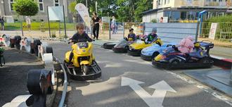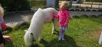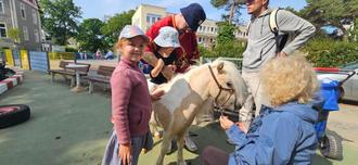 Doch der eigentliche Höhepunkt erwartete uns auf dem Vineta Spielplatz in Zinnowitz. Sabine Schlechter und ihr engagiertes Team hatten sich etwas ganz Besonderes für diesen Tag einfallen lassen. Wir wurden von einem süßen Minipony namens Palomino begrüßt. Das Pony durfte nicht nur gestreichelt, sondern auch geritten werden – ein echtes Erlebnis für die Kinder. Darüber hinaus erzählte uns Frau Schlechter, dass alle Kinder den gesamten Vormittag kostenlos mit elektrischen Fahrzeugen auf dem Spielplatz fahren durften. Dieses Angebot wurde mit großer Begeisterung angenommen. Die kleinen Fahrerinnen und Fahrer zeigten dabei erstaunliche Ausdauer und jede Menge Fahrfreude.