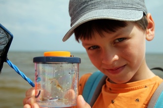 An und in die Ostsee geht es mit dem Kescher auf „Beutefang“. Oft werden Quallen gefangen und auch hier und da mal eine Glasgarnelen. Die Kids zeigen sich oft stolz in dem mit einer Lupe versehenen Becher ihre Ausbeute. Außerdem werden viele Exemplare der Herzmuschel, der baltischen Plattmuschel - auch rote Bohne genannt - der „schlechten Laune“ (Miesmuschel), die als einzige auch essbar ist, der Sandklaffmuschel, die sich tief in den Meeresboden eingräbt, gefunden.
