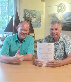 Michael Dumke (Bürgermeister Gemeinde Trassenheide, BFT) und Torsten Kaliebe (1. Stellvertretender Bürgermeister) mit dem Zuwendungsbescheid (v.r.n.l)