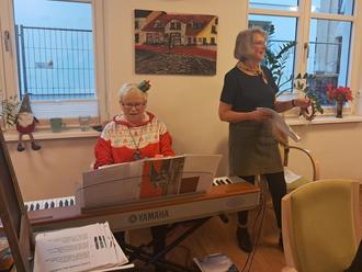 Nach den aufregenden Momenten am Vormittag folgte ein festliches Mittagessen. Die Präsenzkräfte Angela Kelm und Jutta Masgaj verwöhnten die Tagesgäste mit einer klassischen Weihnachtsspeise: Fleischroulade mit Rotkohl und Kartoffelklößen. Als Nachtisch gab es frische, warme Waffeln mit Eis. Das ganze Haus duftete herrlich nach dem leckern Festessen. Am Nachmittag wurde es musikalisch und gemütlich bei Kaffee und Kuchen. Lucia Dirks und Sabine vom Bruch besuchten die Tagespflege und sangen gemeinsam mit den Tagesgästen traditionelle Weihnachtslieder. Lucia Dirks begleitete den Gesang dabei gefühlvoll auf ihrem Keyboard. Die gesamte Feier war ein großer Erfolg und spiegelte die herzliche und familiäre Atmosphäre wider, die in der Tagespflege das ganze Jahr über gepflegt wird.