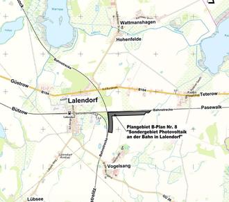 Die Gemeindevertretung der Gemeinde Lalendorf hat in ihrer Sitzung am 09.11.2022 den Beschluss zur Aufstellung des Bebauungsplanes Nr. 8 „Sondergebiet Photovoltaikanlage an der Bahn Lalendorf“ gefasst und die damit verbundenen Verfahren eingeleitet.