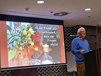 Zum Thema „Humor ist der Knopf, der verhindert, dass der Kragen platzt“ sprach Arno Backhaus aus Calden bei Kassel. Er ist ein deutscher christlicher Liedermacher, Autor und Aktionskünstler, der sich selbst als „E-fun-gelist“ und „Missio-Narr“ bezeichnet. Er ist seit über 40 Jahren im gesamten deutschsprachigen Raum unterwegs mit Konzerten, Eheseminaren, ADHSSeminaren, Straßenaktionen.