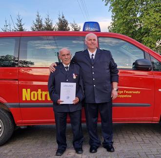 Neun Kameradinnen und Kameraden wurden für ihre 10-, 20- und 25 jährige Zugehörigkeit zur FFw geehrt. Herr Richard Kilisz aus Koppelow toppt sie allerdings alle. Bereits 50 Jahre ist er in Koppelow Feuerwehrmitglied, inzwischen in der Ehrenabteilung.