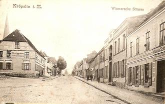Ca. 1905 hieß die jetzige Hauptstraße bis zum Markt noch Wismarsche Straße. Damals war dieser Straßenabschnitt die Lebensader und Einkaufsstraße. Gasthäuser, Hotels und gute Geschäfte waren in diesem Bereich angesiedelt.