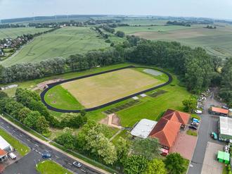 Die Bauarbeiten auf dem Sportplatz befinden sich buchstäblich auf der Zielgeraden. Nach Verlegung von Be- und Entwässerungssystemen wurde in den vergangenen Wochen die Drain- und Rasentragschicht aufgebracht und anschließend der Rasen eingesät. Mittlerweile sprießt bereits das erste Grün. Die Verlegung der 400 Meter langen Kunststofflaufbahn ist für die 24. KW vorgesehen. Der Untergrund hierfür aus Asphalt ist bereits hergestellt. Als Restarbeiten stehen in den kommenden Tagen die Gestaltung der Außenanlagen / Zuwegungen an. Hier wird eine barrierefreie Rampe als Zugang von der Schulstraße aus gebaut. Bis zur Bespielbarkeit des Fußballplatzes kann es noch ein paar Wochen dauern, da der neue Rasen eine ausreichende Anwachszeit benötigt.