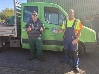 Kai-Ingo Retzlaff begleitete Enrico Bienas, den Leiter des Bauhofs der Stadt Kröpelin, einen Tag lang bei seiner Arbeit. Auf dem abwechslungsreichen Tagesprogramm standen unter anderem das Auslichten von Ahornbäumen, das Schreddern des Schnittgutes sowie der Batteriewechsel an einer Geschwindigkeitsanzeige. Ein besonderes Highlight war, dass an diesem Tag auch die Abholung einer vom Michaelwerk reparierten Waldbank auf dem Plan stand – ein Auftrag der Stadt Kröpelin. Auch beim anschließenden Aufstellen der Bank konnte Herr Retzlaff tatkräftig mithelfen. „Ein schöner Zufall, dass gerade an diesem Tag die gemeinsame Arbeit so symbolisch wurde“, freut sich Marina Strogies, Arbeitsbereichsleiterin des Michaelwerks Kröpelin. Sowohl Herr Retzlaff als auch Herr Bienas zogen am Ende eine positive Bilanz des gelungenen Schichtwechseltages.