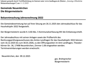 Der Jahresabschluss mit seinen Anlagen sowie der Prüfbericht des Rechnungsprüfungsausschusses des Amtes Landhagen für das Haushaltsjahr 2022 können vom 16.12.2025 bis zum 30.01.2026, zu den Öffnungszeiten im Amt Landhagen, Theodor- Körner-Str. 36, 17498 Neuenkirchen, Zimmer 1.06 eingesehen werden. Terminvereinbarungen werden erwünscht.
