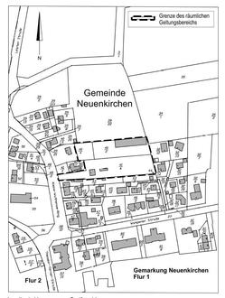 Das Plangebiet umfasst auf der Flur 1 der Gemarkung Neuenkirchen folgende Flurstücke: 40/2, 41/6 und 44 sowie anteilig das Flurstück 40/4. Es ist ca. 0,8 ha. groß.