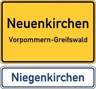 Die Gemeinde Neuenkirchen vor den Toren der Stadt Greifswald hat sich entschieden, ein Zusatzschild am Ortseingang mit dem plattdeutschen Ortsnamen „Niegenkirchen“ zu tragen.