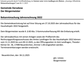 Der Jahresabschluss mit seinen Anlagen sowie der Prüfbericht des Rechnungsprüfungsausschusses des Amtes Landhagen für das Haushaltsjahr 2022 können vom 11.11.2025 bis zum 09.12.2025, zu den Öffnungszeiten im Amt Landhagen, Theodor-Körner-Str. 36, 17498 Neuenkirchen, Zimmer 1.06 eingesehen werden.
