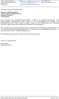 Nach Abschluss der Stellenbesetzungsverfahren verbleiben die Bewerbungsunterlagen nicht berücksichtigter Bewerber/innen einen Monat bei der Geschäftsstelle des Wasser- und Bodenverbandes und werden danach vernichtet. Wenn Sie die Rücksendung Ihrer Unterlagen wünschen, legen Sie bitte einen ausreichend frankierten Rückumschlag bei.