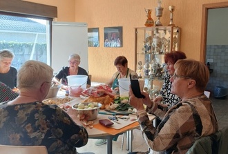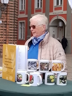 Der Oktober stand bei uns im Zeichen der Erntedankfeste. Schon wie 2019 fanden das Landeserntedankfest in Stralsund und das in Neuenkirchen parallel zueinander statt. Da waren wiedermal fleißige Landfrauen in Neuenkirchen wie auch in Stralsund hier insbesondere die Grimmener Landfrauen gefragt. Sie haben wie schon für andere Landeserntedankfeste so auch in diesem Jahr wieder die Erntekrone gebunden. Ein Prachtstück, dem man nicht ansieht, was für eine Heidenarbeit darin steckt. Wochen vorher wurde das notwendige Getreide geschnitten, getrocknet, Sträuße gebunden und letztendlich alles zu einer Krone zusammengefügt. In der Stralsunder Marienkirche geweiht wurde sie dann standesgemäß mit Kran auf den zentralen Festplatz befördert. Nicht nur in Grimmen waren fleißige Landfrauen am Werk. Auch in Neuenkirchen konnte man sie schon im Vorfeld des Erntedankfestes im Gemeindezentrum finden. Kartoffelsuppe kochen stand auf dem Programm. Es wurden fleißig geschält, geschnippelt gerührt, geschwatzt, gelacht und nach getaner Arbeit noch ein wenig bei Kaffee und Kuchen zusammengesessen. Das Erntedankfest konnte kommen. Gutes Wetter hatten wir auch bestellt! So unmittelbar vor der Haustür, in Stralsund, lockte uns aber auch in diesem Jahr das zentrale Fest wieder. Wenn wir auch nicht, wie 2019, einen großen Kuchenbasar zu wuppen hatten, waren wir mit einem kleinen Stand, in kleiner Besetzung vor Ort, Seite an Seite mit dem Bauernverband Nordvorpommern. Wir wollten und haben die Gelegenheit genutzt unser noch fast druckfrisches Kochbuch zu präsentieren. In den vielen Gesprächen mit den Besuchern der Festmeile, Einheimischen aber auch vielen Gästen haben wir hier wieder sehr deutlich gemerkt, daß wir mit dem Buch ganz offensichtlich einen Nerv getroffen haben. Die traditionelle regionale Küche wieder in den Blickpunkt zu rücken, ist bei den Besuchern nicht nur auf großes Interesse gestoßen, sondern hat vielfältige Erinnerungen geweckt, Freude und Dankbarkeit ausgelöst.