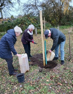 Neben den Erntedankfesten wollten wir eigentlich uns im Oktober an der vom Landesverband imitierten Aktion “Einheitsbuddeln“ beteiligen. Die 2019 in Schleswig-Holstein geborene Idee, das jeder Bürger anläßlich des Tages der Deutschen Einheit einen Baum pflanzt, hat sich inzwischen zu einer Initiative gemausert. 350.000 Bäume wurden in den letzten Jahren gepflanzt. In diesem Jahr hat Manuela Schwesig die Schirmherrschaft über die Pflanzaktion übernommen. Wir haben uns an dieser Aktion, wenn auch etwas verspätet beteiligt, haben in Wampen einen besonderen Baum gepflanzt, einen „Klimabaum“, einen Speierling. Wir haben uns ganz bewusst für dieses Wildobstgehölz entschieden. Der Speierling ist ein seit tausenden Jahren kultiviertes Obstgehölz, das zu Unrecht fast verschwunden ist, heute auf der roten Liste der bedrohten Baumarten steht. Da er besser mit den sich verändernden Klimabedingungen als andere Baumarten zu recht kommt, ist er ökologisch so wertvoll. Er ist Bienenweide, Vogelnährgehölz und seine Früchte werden von Gourmets geschätzt.