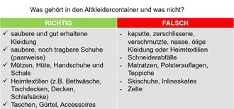 Alttextilien, die wiederverwendet werden können, gehören ausschließlich in die vorgesehenen Container. Wie bei Altpapier, Pappe und Kartonagen ist es nicht zulässig, Abfälle neben die Sammelbehälter zu stellen. Außerdem können wiederverwendungsfähige Textilien kostenfrei auf den Wertstoffhöfen des Landkreises abgegeben werden. Stark verschmutzte oder beschädigte Kleidungsstücke gelten als Abfall und gehören in den Restmüll!