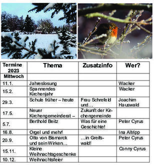 Liebe Gemeindeglieder und an unserer Kirchengemeinde Interessierte, herzliche Einladung zunächst zu unseren Seniorenkreisterminen, gesammelt fürs Jahr auf einen Blick! Bitte geben Sie das auch an Interessierte weiter. Alle sind willkommen, auch wer nicht zur Kirche oder Gemeinde gehört!