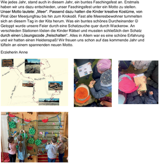 Getoppt wurde unsere Feier durch eine Schatzsuche quer durch Wackerow. An verschiedenen Stationen lösten die Kinder Rätsel und mussten schließlich den Schatz durch einen Lösungscode „freischalten“. Alles in Allem war es eine schöne Erfahrung und wir hatten einen Heidenspaß! Wir freuen uns schon auf das kommende Jahr und tüfteln an einem spannenden neuen Motto.