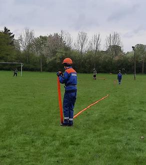 Beim Wettkampf, der als Staffellauf in Anlehnung an den B-Teil des Bundeswettbewerbs der Deutschen Jugendfeuerwehr erfolgte, galt es zügig einen C-Schlauch aufzurollen, sich schnell seine persönliche Schutzausrüstung anzuziehen, ein Strahlrohr mit Knoten einzubinden und mit dem Leinenbeutel einen bestimmten Bereich zu treffen. So wurde von den Kindern nicht nur Schnelligkeit sondern auch Feuerwehrwissen und Teamgeist gefordert. Am Ende ging es tatsächlich um Sekunden.