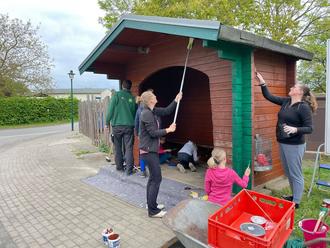 Am 10. Mai wurde nicht nur gestrichen, sondern auch herzlich gelacht: Unsere kleine Streichaktion an der Bushaltestelle war ein voller Erfolg! Mit dabei waren viele fleißige Kinderhände und engagierte Eltern, die das Wartehäuschen in fröhlicher Gemeinschaft wieder auf Vordermann brachten.