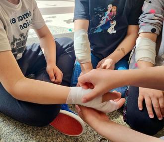 In den Kindergartengruppen Igel und Fröschen drehte sich alles um das Projekt “Kleine Retter”. Bei einem Besuch einer Sanitäterin konnten alle Kinder Erfahrungen zur Ersten-Hilfe sammeln und eine Prüfung zum Plasterführerschein absolvieren. Nun werden täglich die Kuscheltiere und Puppen fachmännisch versorgt.