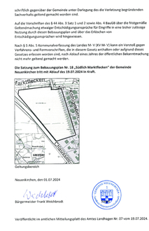Die Satzung zum Bebauungsplan Nr. 18 „Südlich Marktflecken“ der Gemeinde Neuenkirchen tritt mit Ablauf des 19.07.2024 in Kraft.