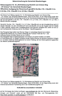 Der Entwurf zum Bebauungsplan Nr. 16 „Wohnbebauung Westlich vom Grünen Weg - OT Gristow“ der Gemeinde Mesekenhagen, Stand 02.05.2025, mit der Begründung sowie dem Artenschutzrechtlichen Fachbeitrag wird in der Veröffentlichungsfrist vom