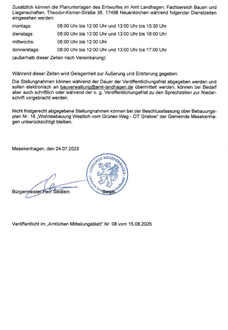 Zusätzlich können die Planunterlagen des Entwurfes im Amt Landhagen, Fachbereich Bauen und Liegenschaften, Theodor-Körner-Straße 36, 17498 Neuenkirchen während folgender Dienstzeiten eingesehen werden:
