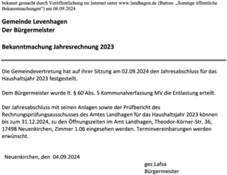 Der Jahresabschluss mit seinen Anlagen sowie der Prüfbericht des Rechnungsprüfungsausschusses des Amtes Landhagen für das Haushaltsjahr 2023 können bis zum 31.12.2024, zu den Öffnungszeiten im Amt Landhagen, Theodor-Körner-Str. 36, 17498 Neuenkirchen, Zimmer 1.06 eingesehen werden. Terminvereinbarungen werden erwünscht.