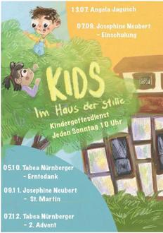 Wir feiern mindestens einmal im Monat Kindergottesdienst. Wir beginnen gemeinsam mit Alt und Jung um 10.00 Uhr in der Kirche, danach sind die Kinder ins Pfarrhaus eingeladen zum gemeinsamen Spielen, Geschichten hören, basteln und zusammen Spaß haben. Geleitet und vorbereitet werden die Kindergottesdienste von engagierten Eltern und Großeltern aus unserer Gemeinde.