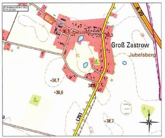 Übersichtskarte für den Ortsteil Groß Zastrow aus dem Geoportal.MV mit Kennzeichnung des Geltungsbereiches des Bebauungsplangebietes Nr. 9