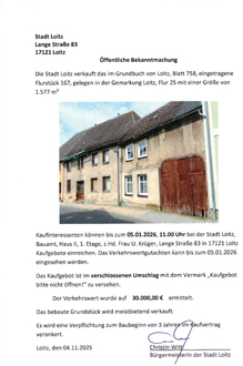 Kaufinteressenten können bis zum 05.01.2026, 11.00 Uhr bei der Stadt Loitz, Bauamt, Haus II, 1. Etage, z.Hd. Frau U. Krüger, Lange Straße 83 in 17121 Loitz Kaufgebote einreichen. Das Verkehrswertgutachten kann bis zum 05.01.2026 eingesehen werden.
