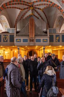 Nicht gerade ideales Wetter für eine Führung durch die Stadt Loitz. Dennoch ließen sich 18 ehemalige Studienkollegen nicht davon abhalten, der Spur der Sophia Hedwig zu folgen. Geführt von Sigrid Daus, nahmen die ehemaligen Kommilitonen die in der Marienkirche vom Restaurator Georg von Knorre fertiggestellten Ahnentafeln in den Fokus. Dabei war von Vorteil, dass der Organisator der Stadtführung, Dr. Eckhard Oberdörfer, ein guter Bekannter von Frau Dr. Monika Schneikart ist, die Biografien zu sämtlichen Personen, die ursprünglich auf den Wappentafeln präsentiert wurden, schrieb. Somit konnte das Interesse mit zusätzlichem Wissen beflügelt werden. Nach der Besichtigung der historischen Bibliothek ging es in die nebelverhangenen Straßen der Loitzer Altstadt. Entdeckungen an jeder Ecke, Spuren der Vergangenheit mischten sich mit der Gegenwart. Die in Bronze gegossene Statue der Herzogen- Witwe Sophia Hedwig vor dem Speicher an der Peene, das Hafenbecken, auf dem Teile des alten Schlosses standen, die Peene- Brücke und schließlich der Kaufmannshof in der Peenestraße 8 mit seinen warmen Räumen des KulturKonsums wurden in Augenschein genommen. Viele Fragen zu der zweitältesten Stadt Vorpommerns konnten geklärt werden und warfen neue auf. Nach einer kleinen Stärkung und dem Film zur Geschichte des Kaufmannshofes aus dem 18 Jhd. musste unbedingt das Schustermuseum noch inspiziert und untersucht werden.
