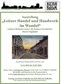 Am 23.01.2025 um 19.00 Uhr laden wir, der Loitzer Heimatverein e.V., herzlich in den KulturKonsum in die Peenestraße 8 ein. Horst Triphahn wird den Rahmen der Ausstellung „Loitzer Handel und Handwerk im Wandel“ nutzen, um weitere Einblicke in einige Gewerbezweige, einzelne Handelshäuser, Verkaufsstellen und Handwerksunternehmen zu geben. Neues und Bekanntes wird somit dem Vergessen entrissen. Sein Sie gespannt.