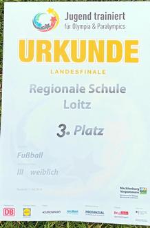 Für das Landesfinale in der Sportart Fußball hatte sich auch ein Mädchenteam aus der Regionalen Schule Loitz qualifiziert. Das Unternehmen Taxi – und Omnibusbetrieb Müller fuhr das Team, Frau Köpp und ihre Sportlehrerin Ch. Sack am 11.06.2024 deshalb nach Rostock. Auch die Bürgermeisterin, Frau Witt hatte sich die Zeit genommen und begleitete die Mädchen an diesem Tag und feuerte sie natürlich während des Wettkampfes auch kräftig an. Am Ende ging es mit einem super 3. Platz nach Hause. So eine Leistung muss natürlich auch belohnt werden, deshalb wurde auf der Rücktour noch ein Zwischenstopp bei MC Donald eingelegt, dort gab es einen kleinen Snack von der Bürgermeisterin. Die Mädels haben mit ihrer Leistung die Stadt Loitz erneut hervorragend vertreten.