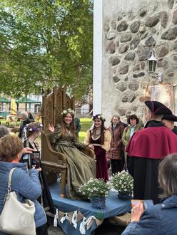 Ein ganz besonderer Tag in Loitz: Die Herzogin Sophia Hedwig persönlich (Merle Goos) mit ihren Zofen (Lisa Heiser & Martha Köpnick) erschien per Kutsche auf dem Kirchplatz und forderte die Anwesenden zu fröhlichem Produzieren und Zusammensein auf. Es wurden Blumenkränze geflochten, Schmuck geschmiedet, Pflanzen begutachtet, mit Schafwolle gefilzt, am Lagerfeuer geklönt, Kuchen vertilgt, Bogen geschossen und Suppe gekocht. Die Besucher spazierten weiter in den Kulturkonsum, wo man die Kunst des Spinnens erleben konnte und kulinarisch bestens versorgt wurde bei Harfenmusik und Strickbasar und am Hafen/an der Destille den herzöglichen Wein verkosten konnte. Während interessierten Besuchern in der Marienkirche Vorträge und Besichtigungen angeboten wurden, formierten sich am frühen Abend die Bläser auf dem Kirchplatz und riefen so schwungvoll die zahlreichen Besucher zum Festgottesdienst. Auch die Herzogin hatte sich auf der Sänfte vom Hafen in Bewegung gesetzt und wurde, samt ihrem Gefolge, mit Jubel an der Marienkirche erwartet. Ein interessanter und aufrüttelnder Festgottesdienst mit schönem