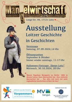 Mit einer kleinen Ausstellung zur Geschichte des Hauses und zu ausgewählten Aspekten der Historie von Loitz laden Antje Borchert und Jens Becker zu einer Hausbesichtigung ein. Wer die beiden kennt, weiß, dass die Ausstellung „Loitzer Geschichte in Geschichten“ mit einem Augenzwinkern zu verstehen ist. Das deutet auch schon der künftige Name des Hauses an – die „Mangelwirtschaft“. Der doppeldeutige Name nimmt Bezug darauf, dass sich hier zu DDR-Zeiten eine Wäschemangel befand, an die sich viele ältere Loitzer noch gut erinnern.